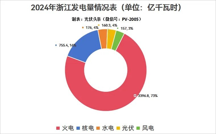 发电量方面,2024年,浙江火电发电占比高达73%。光伏发电量160.3亿千瓦时,占比仅4%。从碳中和碳达峰角度而言,浙江光伏仍然拥有广阔的发展空间。