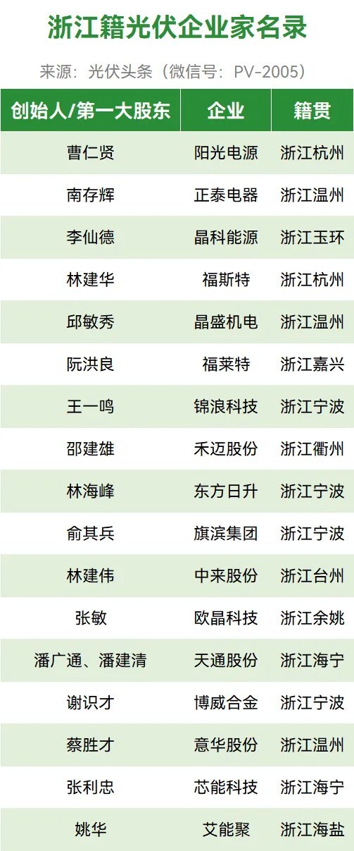 据光伏头条(微信号:PV - 2005)统计,如今光伏上市企业之中,有17家光伏上市企业创始人或控股股东为浙江人。