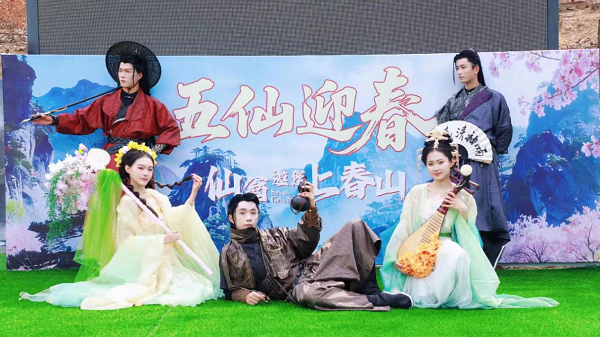 一方面,景区深度融入“春山、春水、春花、春福”元素,仙官、仙君、仙子以春日限定造型亮相,形成完整的“春登蒙山”叙事动线。另一方面,在二门处增设《五仙迎春》迎宾秀,以鲜活的仙侠形象、欢快的演艺节奏与近距离互动,实现游客“入山即入戏”,串联起从山门到山顶的全程巡游动线。