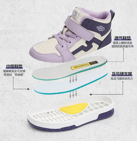 传统儿童足弓鞋大多采用“鞋垫支撑方案”,即在鞋内放置局部增厚的足弓垫。这种方案看似直接,却往往给孩子带来生硬的异物感,容易导致行走疲劳。