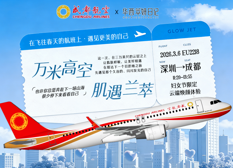 2026年3月6日11时20分,由深圳飞往成都双流的成都航空EU2218航班平稳起飞。与往常不同的是,这架航班被装点为“万米高空,肌遇兰萃”主题客舱——一场由华西萃妍日记与成都航空联合举办的三八妇女节特别活动在云端温情启幕。百余名旅客在三小时的飞行中,通过护肤科普、互动分享、产品体验等环节,在万米高空收获了一份独特的节日礼物。