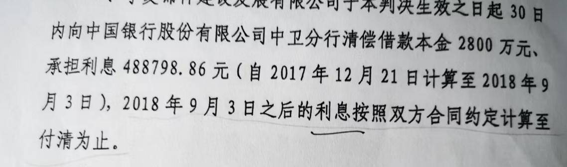 “法院判决的银行本金2800万还清了,48万余元的利息实际至今给付480万,现在银行又计算出了1100多万,企业难以承受,这笔钱于法无据。”刘一某说。他再检视当年的法院判决,重新拿出审判证据材料,他认为中卫市中院的判决有明显偏差。