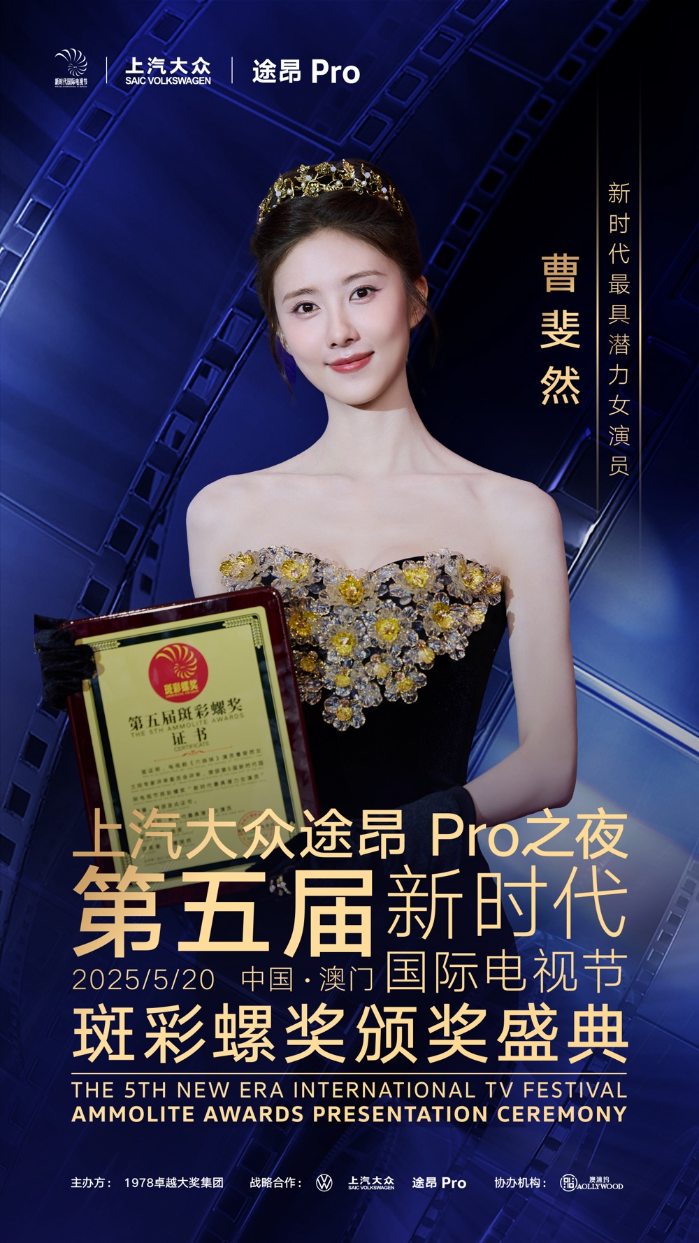 上汽大众途昂Pro之夜第5届新时代国际电视节斑彩螺奖颁奖盛典于5月20日在澳门银河正式举行。评选范围是2024年2月1日至2025年3月31日在中国内地、台湾、香港和澳门两岸四地主流电视台和视频网站播出的华语剧集,斑彩螺奖以“礼赞新时代 奋进新征程”为宗旨,促进中国文艺事业繁荣、传播中国文化、表扬对中国电视领域有杰出贡献的从艺人员,其中,入围新时代潜力5位女演员是曹斐然、陈思澈、吴天琪、杨秀措、张淼怡,经过最终角逐,演员曹斐然携作品《六姊妹》获新时代最具潜力女演员奖。