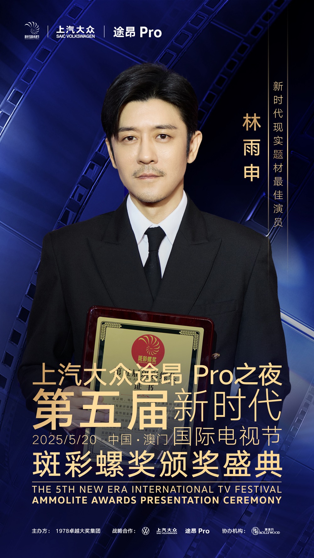 由上汽大众途昂Pro倾情赞助的第五届新时代国际电视节斑彩螺奖5月20日晚在澳门澳门银河举行盛大的颁奖典礼,评选范围是2024年2月1日至2025年3月31日在中国内地、台湾、香港和澳门两岸四地主流电视台和视频网站播出的华语剧集,富大龙、林雨申、聂远、王佳佳、朱珠等5位演员入围角逐新时代现实题材最佳演员。经组委会评审,演员林雨申携作品《蔷薇风暴》获现实题材最佳演员。