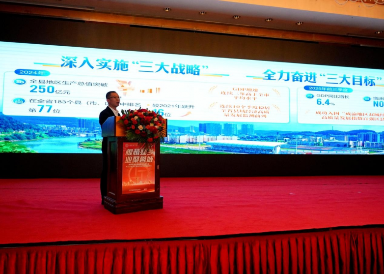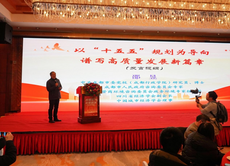 随后,中共成都市委党校(成都行政学院)研究员、博士,成都市人民政府咨询委员会专家,四川省营商环境咨询委员会政务环境专家组组长邵昱研究员带来《以“十五五”规划为导向 谱写高质量发展新篇章》的主旨分享。邵昱研究员深入剖析了国家“十五五”规划的宏观导向,特别提及到第二十届四中全会提出的“十五五”时期经济社会发展建议的主要目标:高质量发展取得显著成效,科技自立自强水平大幅提高,进一步全面深化改革取得新突破,社会文明程度明显提升,人民生活品质不断提高,美丽中国建设取得新的重大进展,国家安全屏障更加巩固。邵昱还结合到盐亭县的实际情况,谏言了盐亭县今后的重点任务与发展方向:聚焦“7+3”产业体系,巩固能源化工、生物医药、绿色食品三大支柱,构建具有盐亭特色的现代化产业体系。他还勉励广大企业家,要主动将企业发展融入国家战略,在新发展格局中找准定位:拥抱科技创新,加速数字化、智能化转型;践行绿色理念,在新能源、节能环保等领域布局未来;深耕国内市场,同时稳妥开拓海外市场;把握区域协调机遇,积极参与成渝地区双城经济圈建设。他的演讲高屋建瓴,为企业家们指明了前进方向,注入了坚定信心。