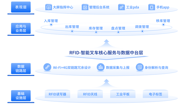 超级码云RFID智能叉车,以RFID射频识别技术为核心,搭建起基础设施层、数据链路层、核心服务与数据中台层、应用与业务层、表现层五层一体化智能架构,实现硬件、数据、业务、管理的全链路打通。